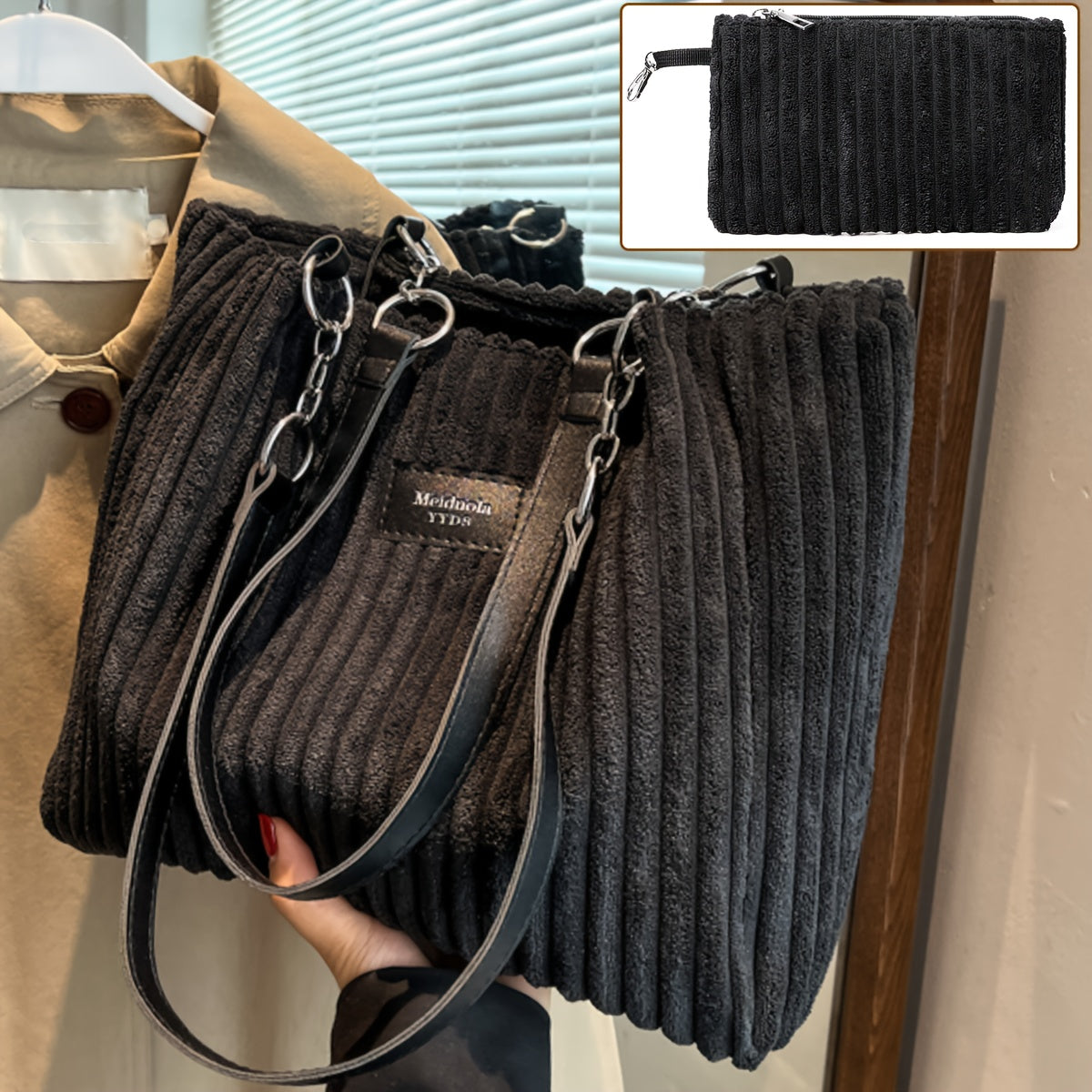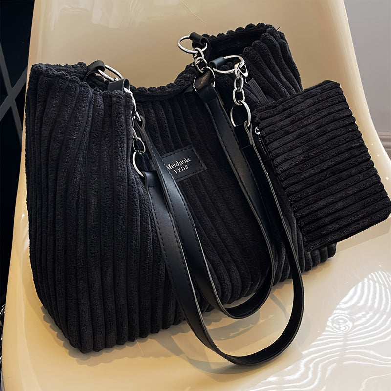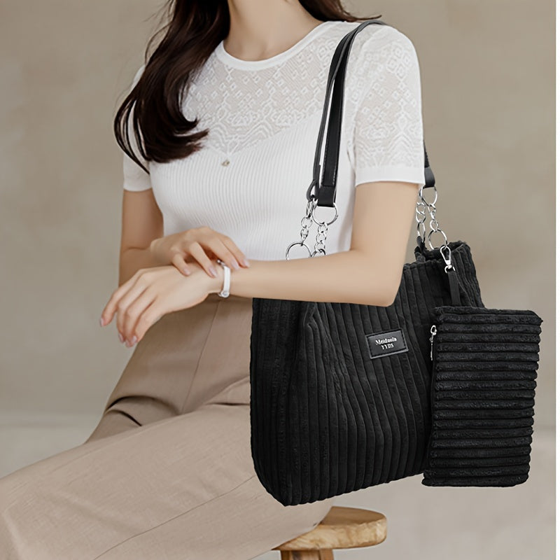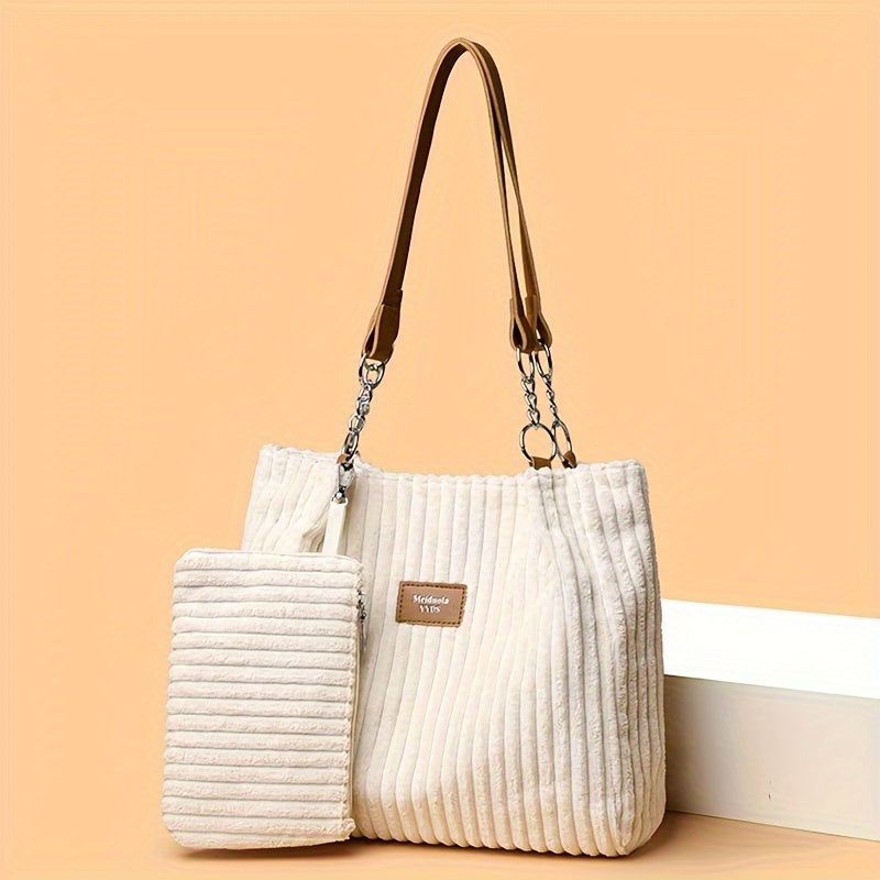 Perfect Lily Women's 2pcs Corduroy Tote & Handbag Set - Elegant Large Capacity Handbags with Zipper Closure, Fixed Strap & Polyester Lining, Beige/White/Green/Black, Versatile for Daily Commute, Work, Shopping - Durable Cordu